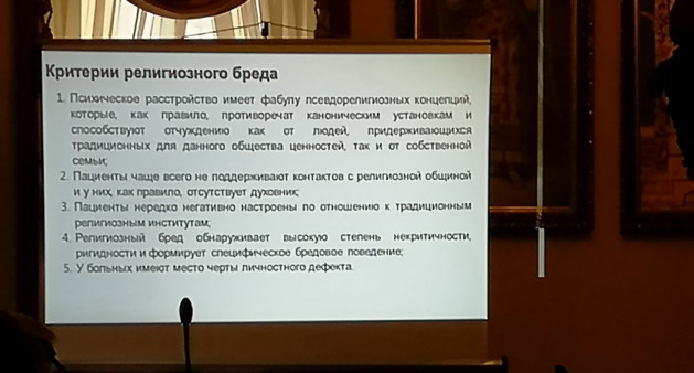 Поскольку заместитель директора Научного центра психического здоровья РАН Григорий Иванович Копейко не смог присутствовать на мероприятии, его доклад прочитала научный сотрудник Центра, кандидат медицинских наук Екатерина Гедевани. Доклад был посвящен теме психического состояния с бредовыми идеями религиозного содержания.