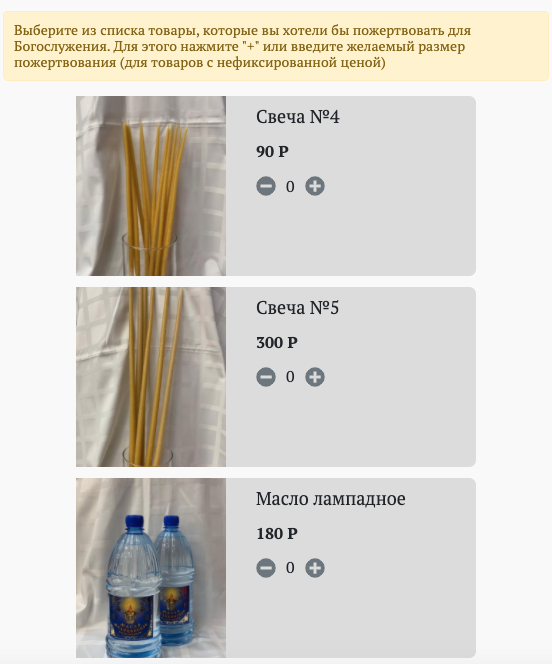 И это очень важный момент. С проблемой многие приходы столкнулись во время карантина. Храму для богослужения нужны вино и хлеб для Евхаристии, масло, чтобы зажечь лампады. Но если прихожан нет, то где взять деньги на приобретение столь необходимых для богослужения вещей? Вот мы и решили создать такой раздел, чтобы каждый прихожанин понимал: для того, чтобы служба в его любимом храме или монастыре продолжалась, надо сделать пожертвование для приобретения необходимых для богослужения продуктов.