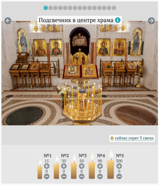 Да. А второй – свечи. Скажу сразу – эта идея родилась совершенно случайно, и своим рождением она обязана моей прабабушке. Когда она не могла пойти в храм, то просила маму поставить свечу к определенной иконе. Вспомнив эту историю, мы решили, что на сервисе «Храм24» тоже должна быть подобная функция – чтобы каждый прихожанин мог выбрать икону, у которой будет гореть его свеча. Интерфейс реализован таким образом, что пользователь воочию видит фотографию из храма, где расположен тот или иной подсвечник.