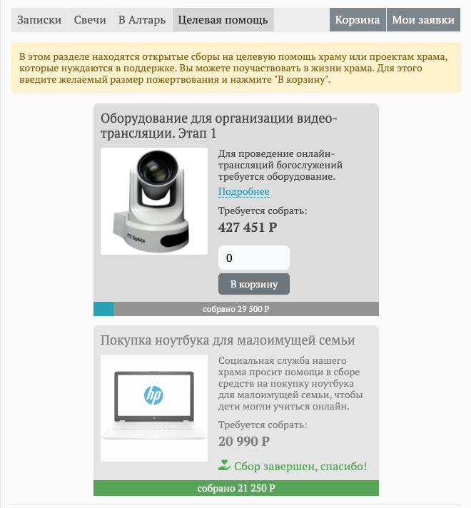 Конечно. Четвертый раздел как раз и называется «Целевая помощь». Здесь монастырь или храм может рассказать, в чем испытывает острую нужду в настоящий момент и объявить целевой сбор помощи. При этом в разделе «Целевая помощь» можно указать необходимую итоговую сумму, чтобы люди могли отслеживать, как идет сбор и сколько еще средств необходимо собрать.