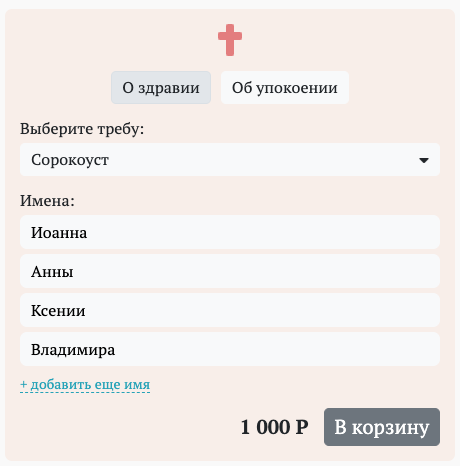 Составленная прихожанином записка кладется в «корзину». При этом у человека в личном кабинете хранится история всех ранее поданных заявок и треб, и, составив однажды записку, ему уже не придется писать ее заново: нажал кнопочку «Повторить», – и всё готово.