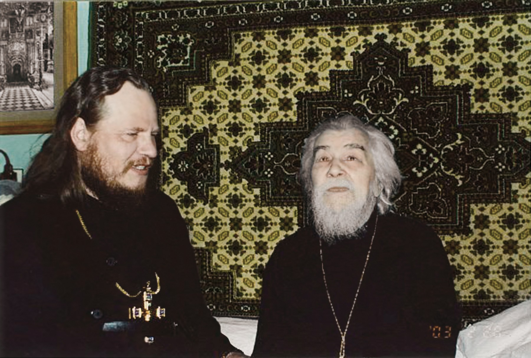 В продолжение разговора о безграничной милости Божией приведу еще один пример, связанный с моим собеседником. 22 сентября 2005 года архимандрит Иосиф отмечал свои именины в Соловецком монастыре и собрал на них настоятелей подворий. Вдруг, по его воспоминаниям, раздается звонок – звонит келейница отца Иоанна (Крестьянкина) Татьяна Сергеевна. Она говорит, что батюшка приглашает отца-наместника в Печоры, затем передает трубку самому старцу… Сразу же после именин отец Иосиф отправился на материк, в Псково-Печерский монастырь. Он тепло пообщался с отцом Иоанном, сфотографировался с ним на память. Отец Иоанн одарил гостя разными подарками, среди которых были собрание сочинений святителя Игнатия (Брянчанинова) и святителя Феофана Затворника, батюшкины полумантия и епитрахиль. А зимой следующего года у отца Иосифа случился инсульт. Один из насельников Спасо-Преображенского Соловецкого ставропигиального мужского монастыря иеромонах Лонгин (Новоселов), который сейчас служит в Москве на подворье, в тот момент был в Печорах. Узнав о беде, он сообщил старцу неутешительные сведения: отец Иосиф находится в крайне тяжелом состоянии и вряд ли выживет. «Рано ему уходить. Не отпустим его», – произнес отец Иоанн и встал на молитву. «Я верю, что по молитвам отца Иоанна я остался жив, а также и соловчане усердно молились о моем выздоровлении», – сказал на прощанье архимандрит Иосиф (Братищев). Наш фотограф Владимир Ходаков сфотографировал батюшку в полумантии всероссийского старца.