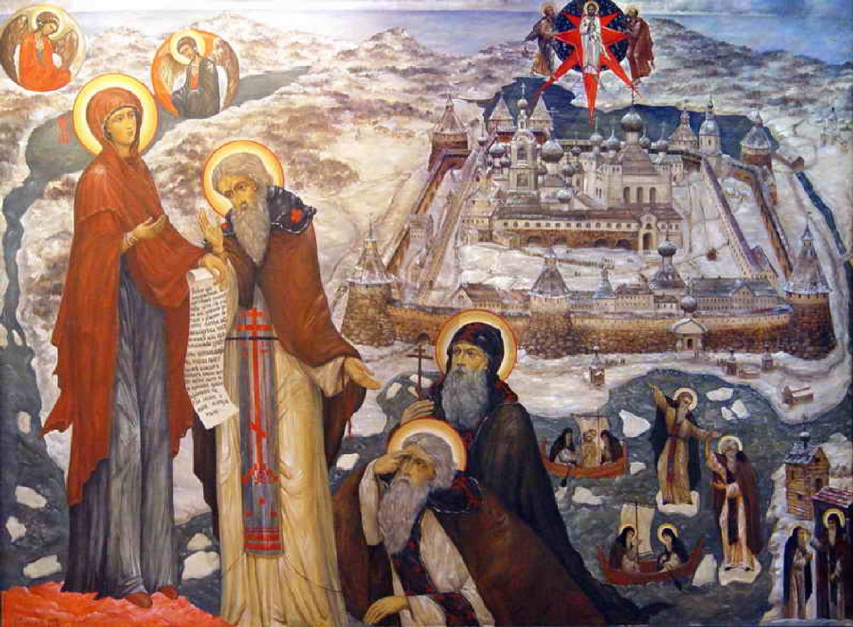 Последнюю свою картину я написал в 1991 году, «Соловецкие святые» [1], и больше почти ничего не писал. Только если по какой-то особой нужде – например, кому-то в подарок. Иконы я начал писать, но опять же по необходимости, ведь из храма все было украдено. Поэтому теперь здесь почти все иконы моей работы. Хотя я, в общем-то, никакой не иконописец. Я не пишу в иконописной технике, тяжелое это дело, и я его не освоил. Я писал эти иконы как картины.