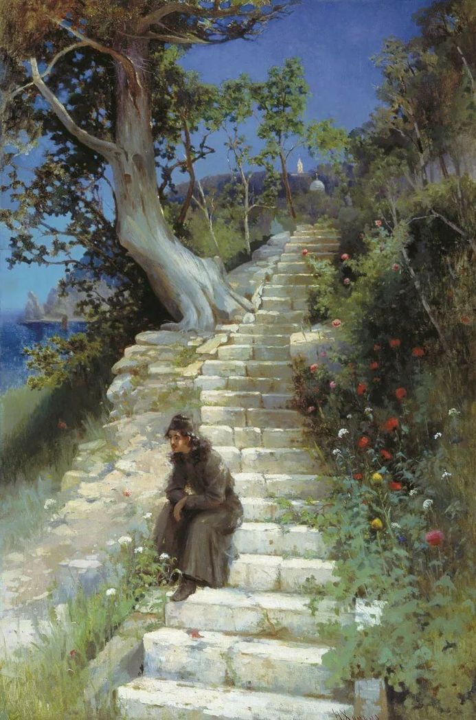 Николай Химона (1864–1929) – уроженец Крыма, где всегда много солнца, где небо высокое, – все это есть в его работе «Отшельник на ступеньках храма». Взгляд молодого монаха направлен одновременно и куда-то вдаль, на море, и вглубь себя. А за иноком – лестница, ведущая туда, где виднеется церковный купол. Вся работа пронизана светом, радостью. И эта красота окружающего мира – отзвук другой, Божественный красоты. Чтобы это понять, надо двигаться вверх по лестнице и, одновременно, от внешнего – в глубину.