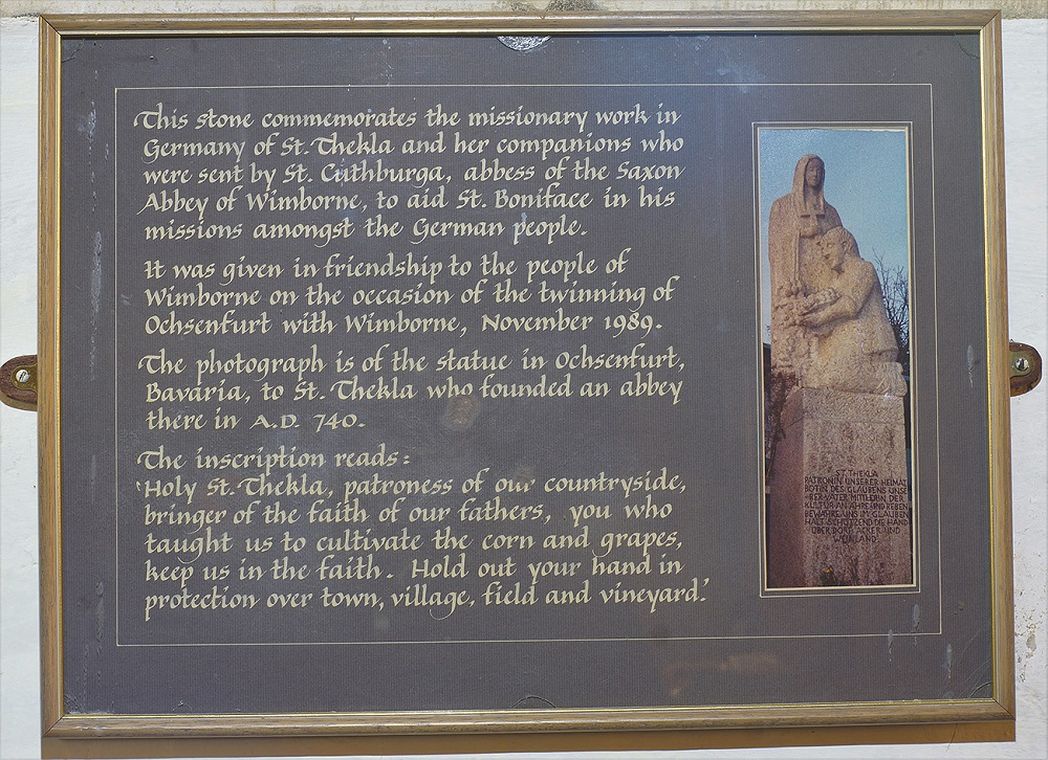 б. «Камень святой Феклы» в крипте храма. Он был подарен церкви, когда представители Уимборна посетили немецкий город Оксенфурт для подписания соглашения о побратимстве (между двумя городами) в ноябре 1988 года. Он был вырезан каменщиком из Оксенфурта. Под камнем имеется табличка с надписью и фотографией, на которой изображена статуя святой Феклы в винограднике в Оксенфурте (где находился ее монастырь), вырезанная тем же каменщиком.