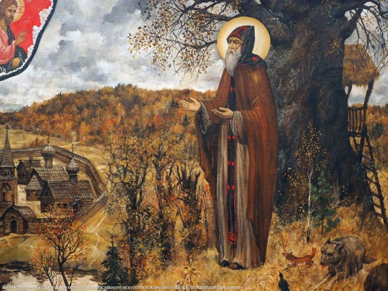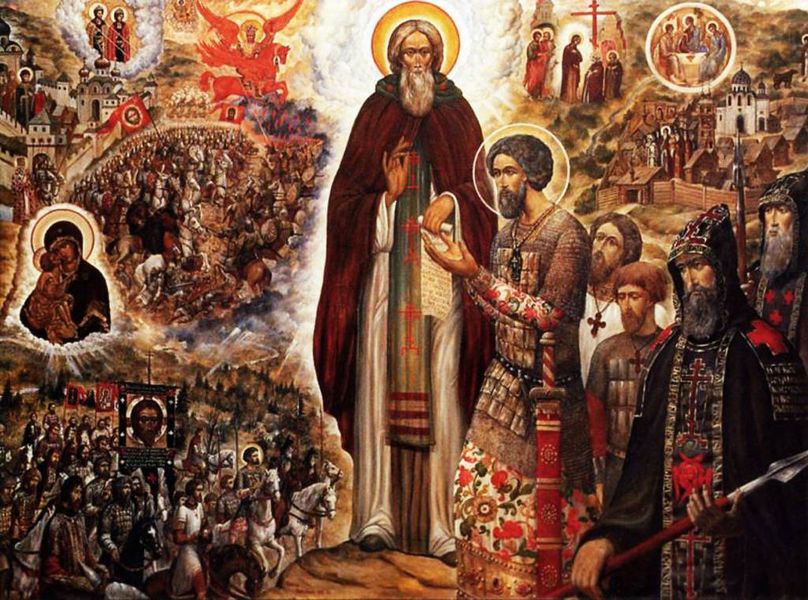 Так, например, в работе «Святые Сергий Радонежский и Дмитрий Донской» на переднем плане – благословение на битву Дмитрия Донского преподобным Сергием Радонежским, справа – посланные преподобным в войско князя два монаха-богатыря Александр Пересвет и Андрей Ослябя.