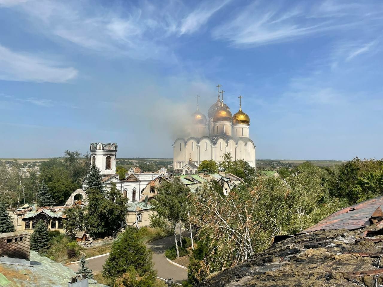 Два купола Успенского собора во время обстрела повреждены. Снаряды дважды прошили верхушку собора насквозь. Купола можно восстановить. То, что они не обрушились и не загорелись, в обители считают чудом.