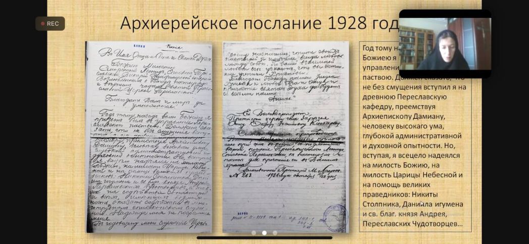 В авангард по сохранению исторической памяти Феодоровский монастырь привлек не только именитых представителей научного сообщества, но и молодых ученых. Хирова Анна Ивановна, составитель образовательного контента информационно-образовательных ресурсов на портале Библиотека информационно-образовательных ресурсов «Умней» (г. Химки), соискатель Историко-архивного института РГГУ, выступила с докладом на тему: «Значение вкладов в поминальной культуре как части православной мемориальной традиции (по материалам вкладной книги и синодика Феодоровского монастыря г. Переславля-Залесского XVI – XVIII вв.)». Анна Ивановна проделала большую работу по изучению истории Феодоровского женского монастыря и выиграла в 2020 году грант на конкурсе проектов молодых ученых по истории Русской Православной Церкви.